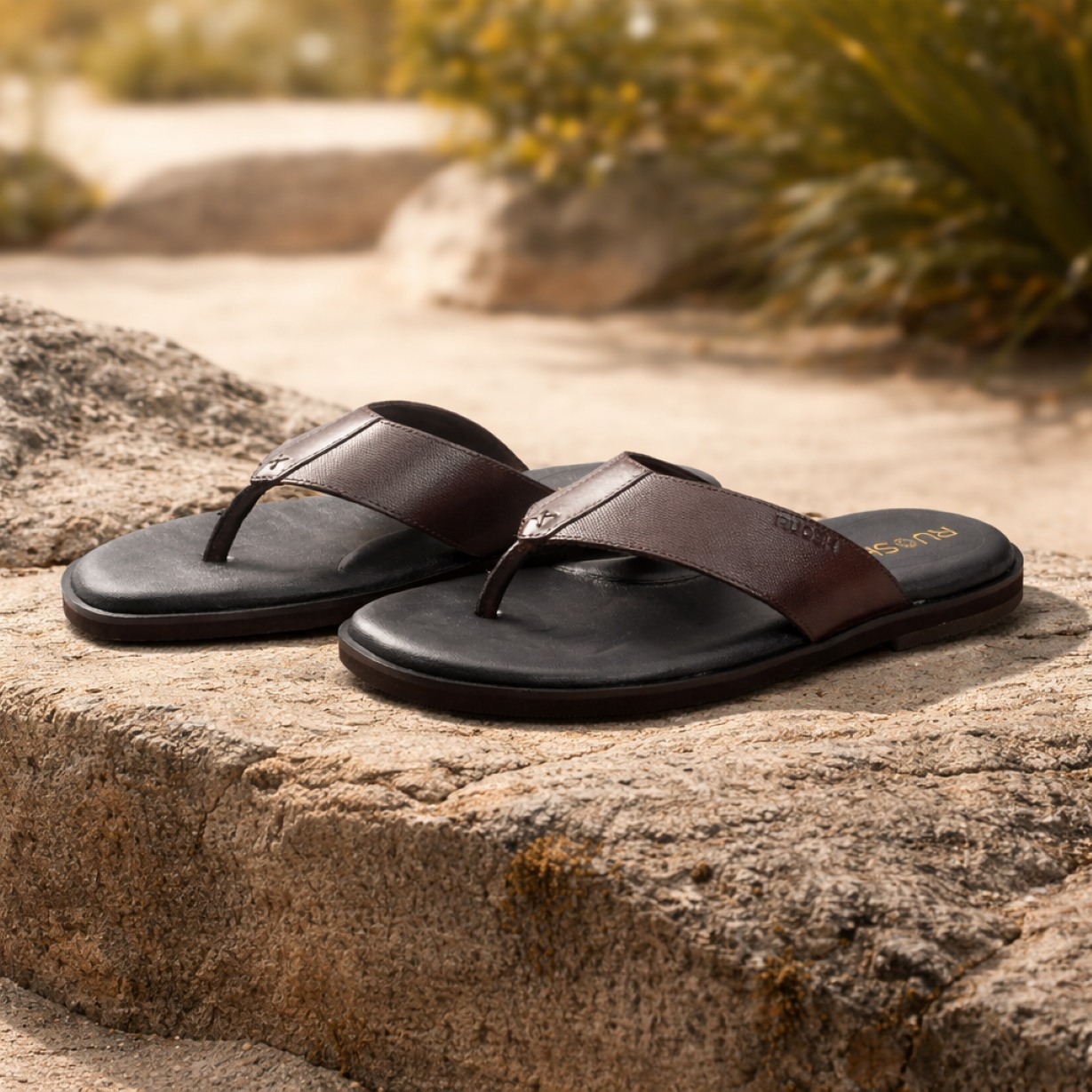 Experience easy comfort with Ruosh Brown Sandals crafted from premium nubuck leather. The soft, textured finish adds a refined casual look. A lightweight EVA sole ensures cushioned, flexible support. Ideal for relaxed, everyday wear with effortless style.
