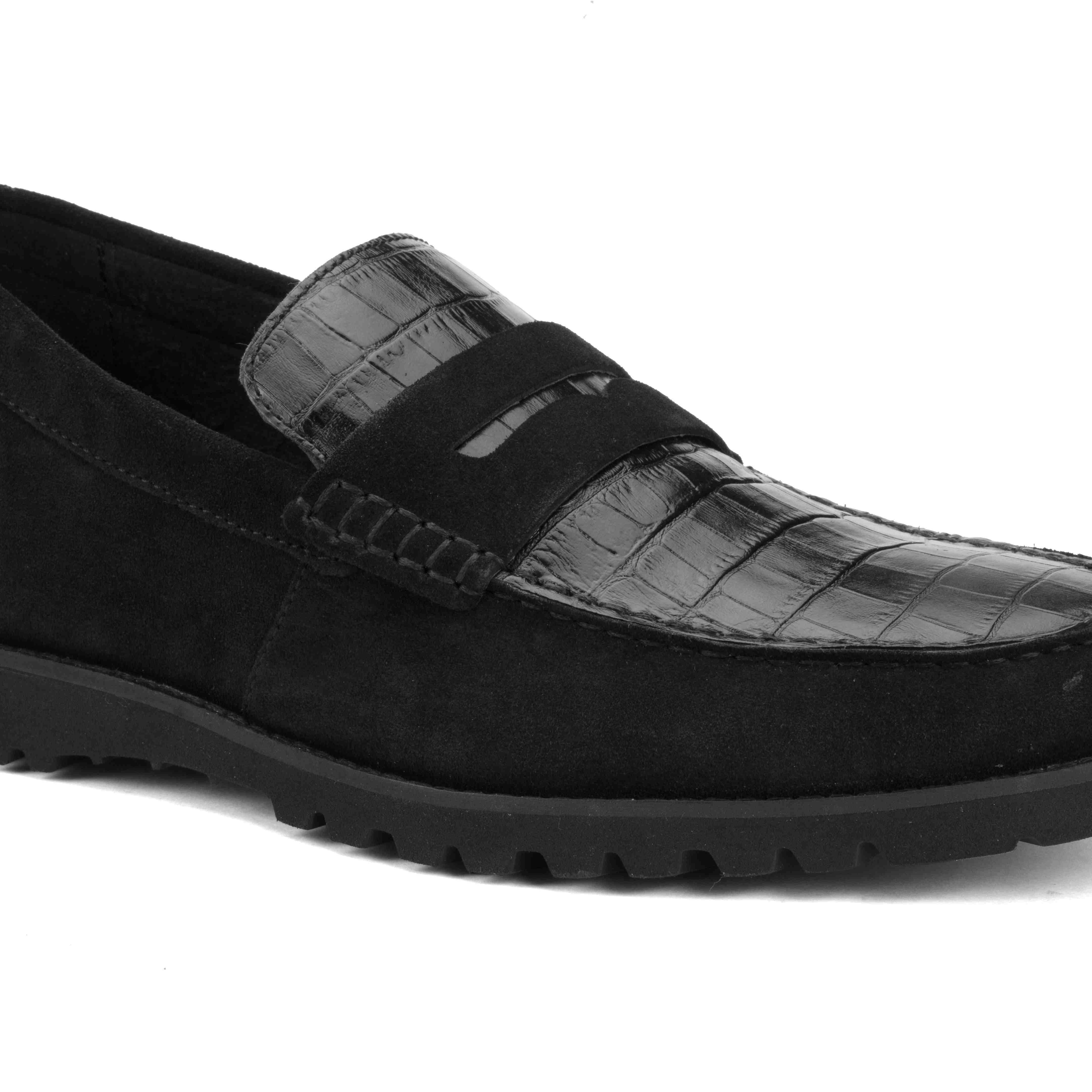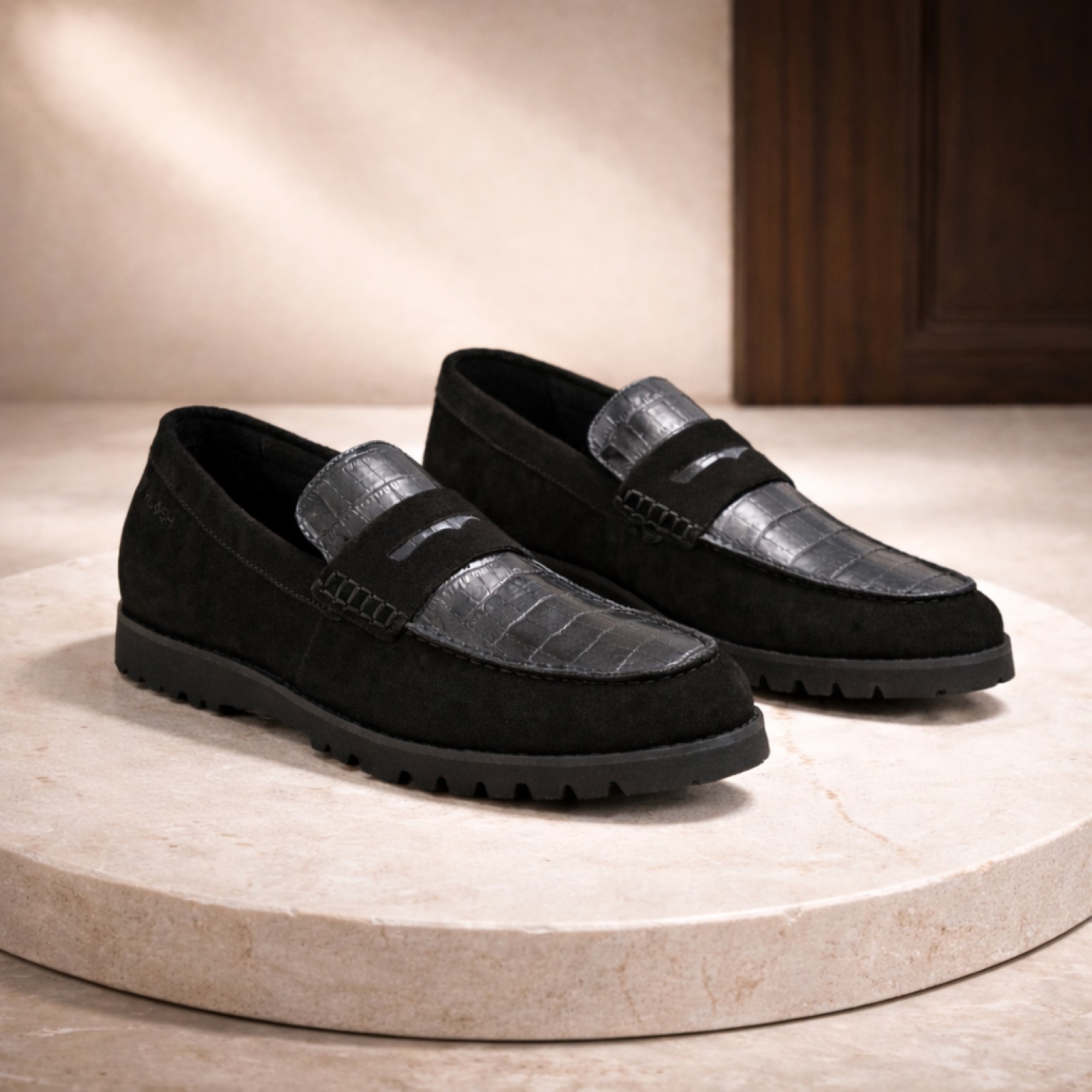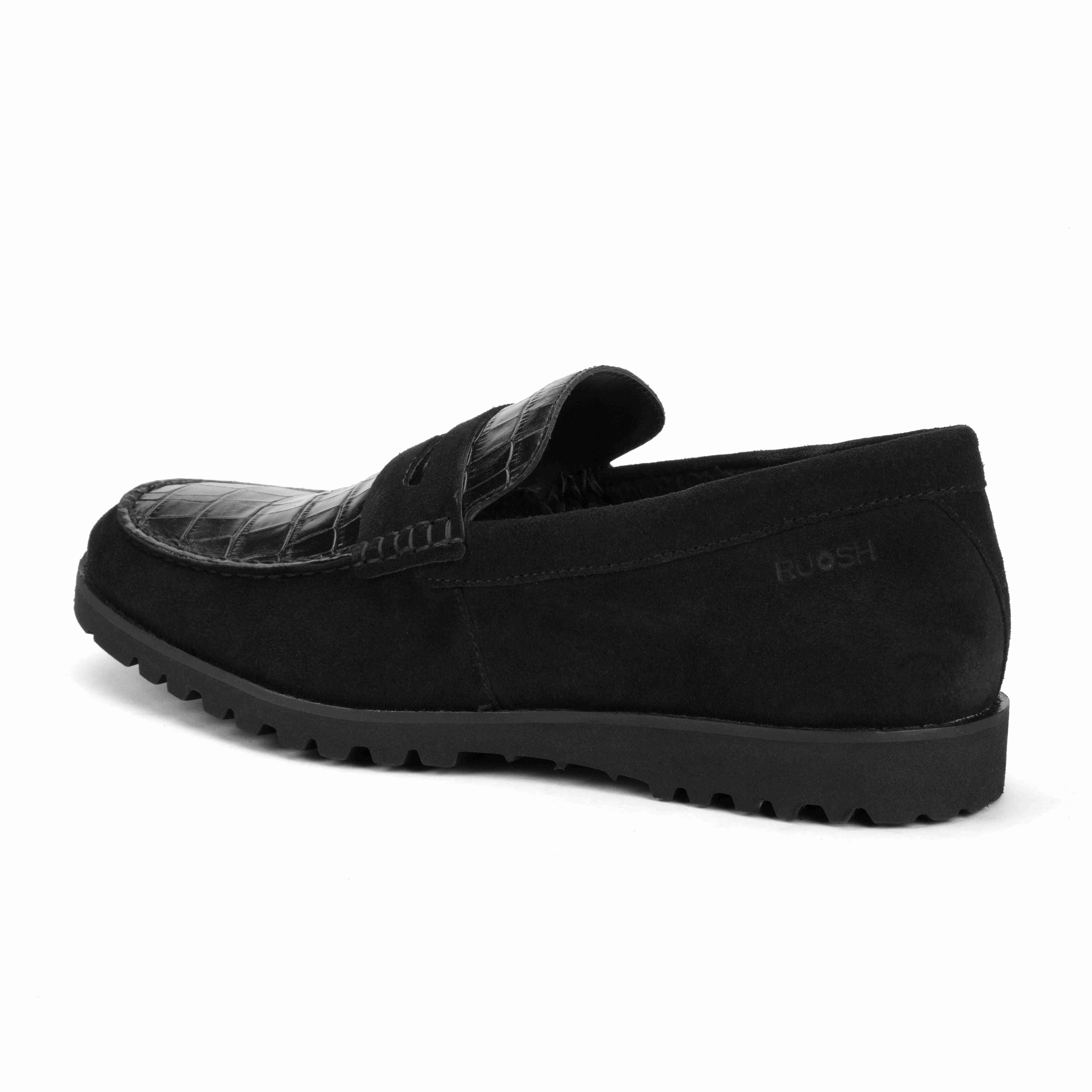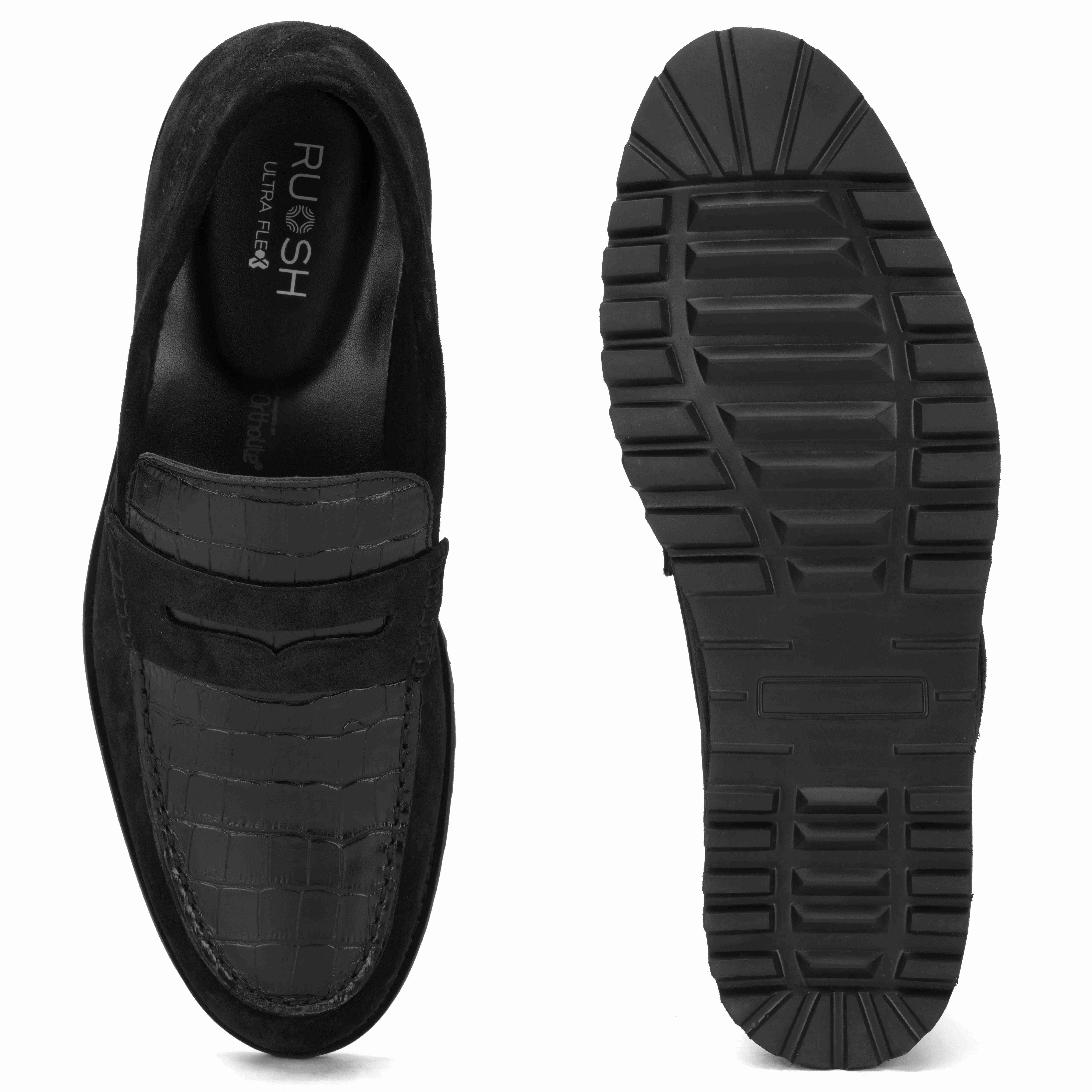 Step into style with Ruosh Black Penny Loafers crafted from premium suede leather. The velvety texture adds a refined, modern touch. A lightweight EVA sole ensures cushioned comfort all day. Smart, sleek, and easy to wear for any casual occasion.