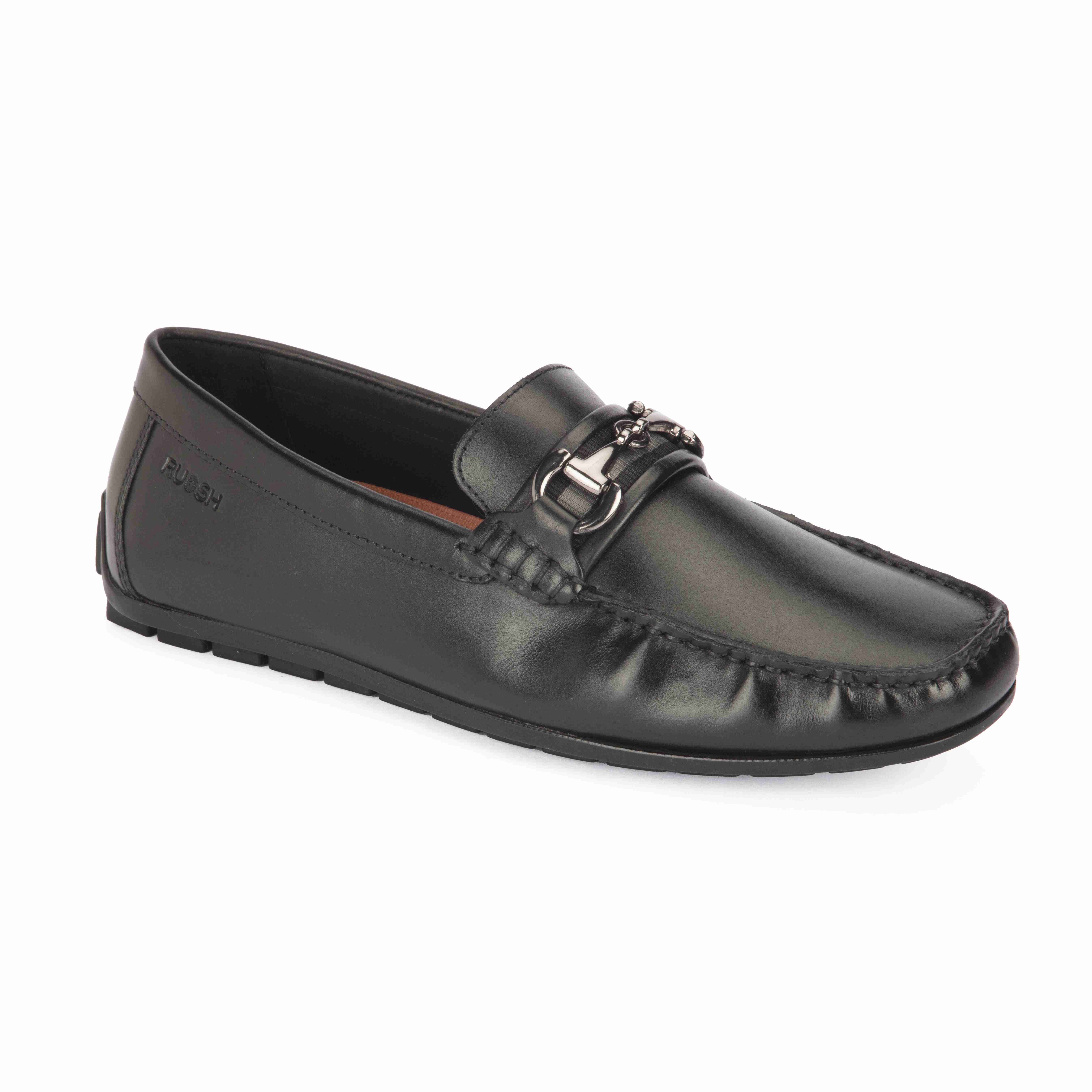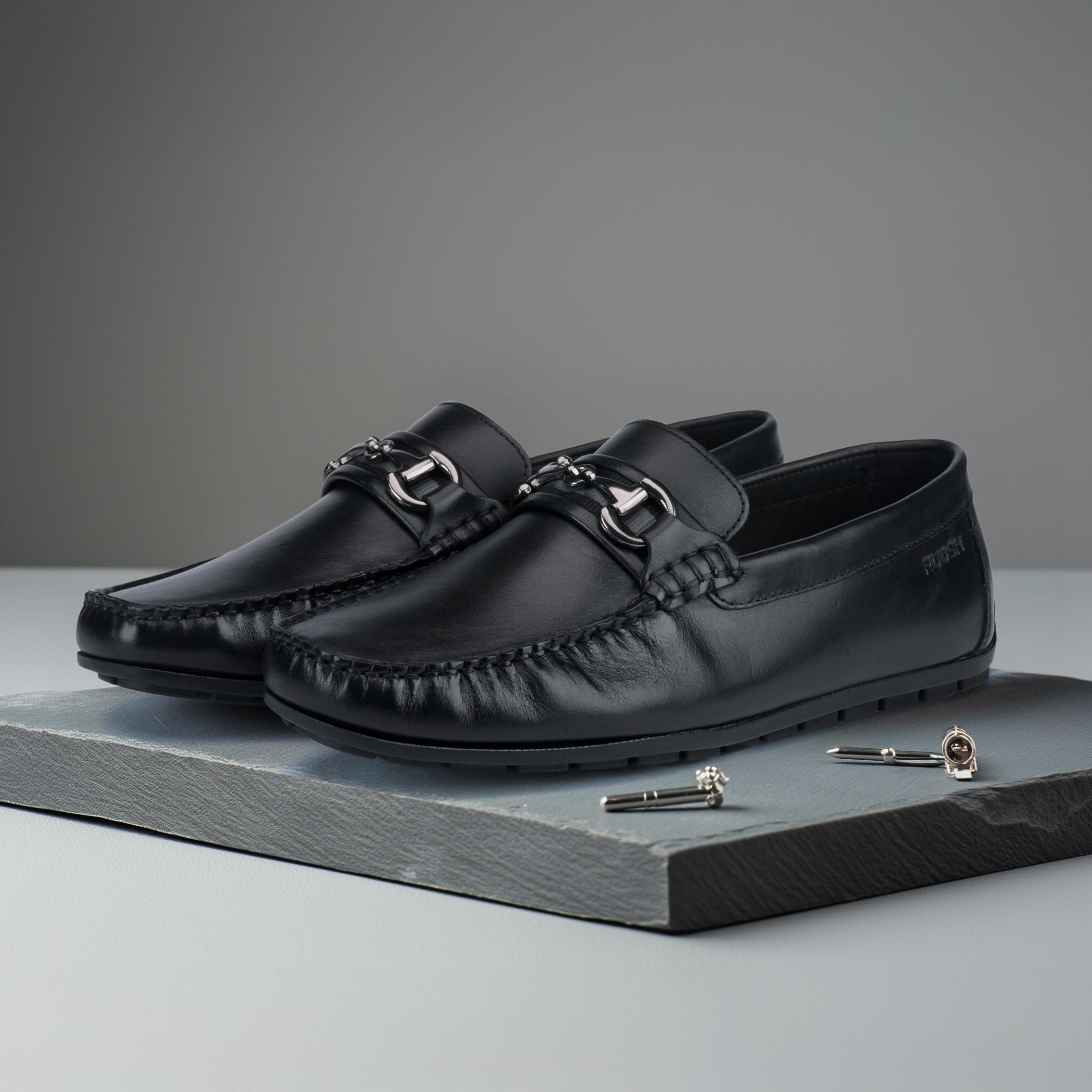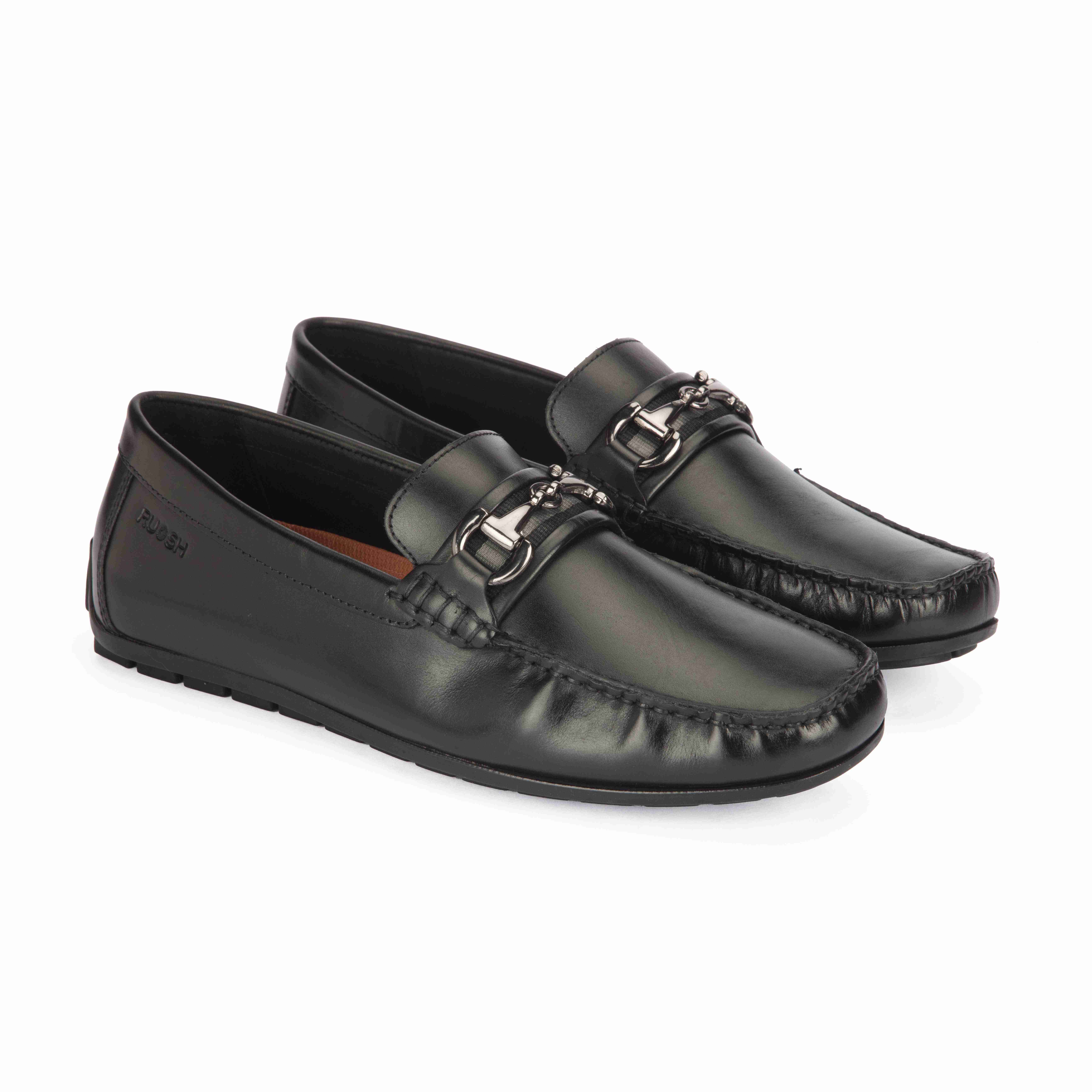 Crafted From Premium Black Leather, These Ruosh Drivers Exude Effortless Elegance. The Sleek Silhouette Is Enhanced By A Bold Metal Buckle Detail, Adding A Refined Edge To Your Everyday Or Smart-Casual Looks. Flexible And Lightweight, They Promise Comfort With Every Step.