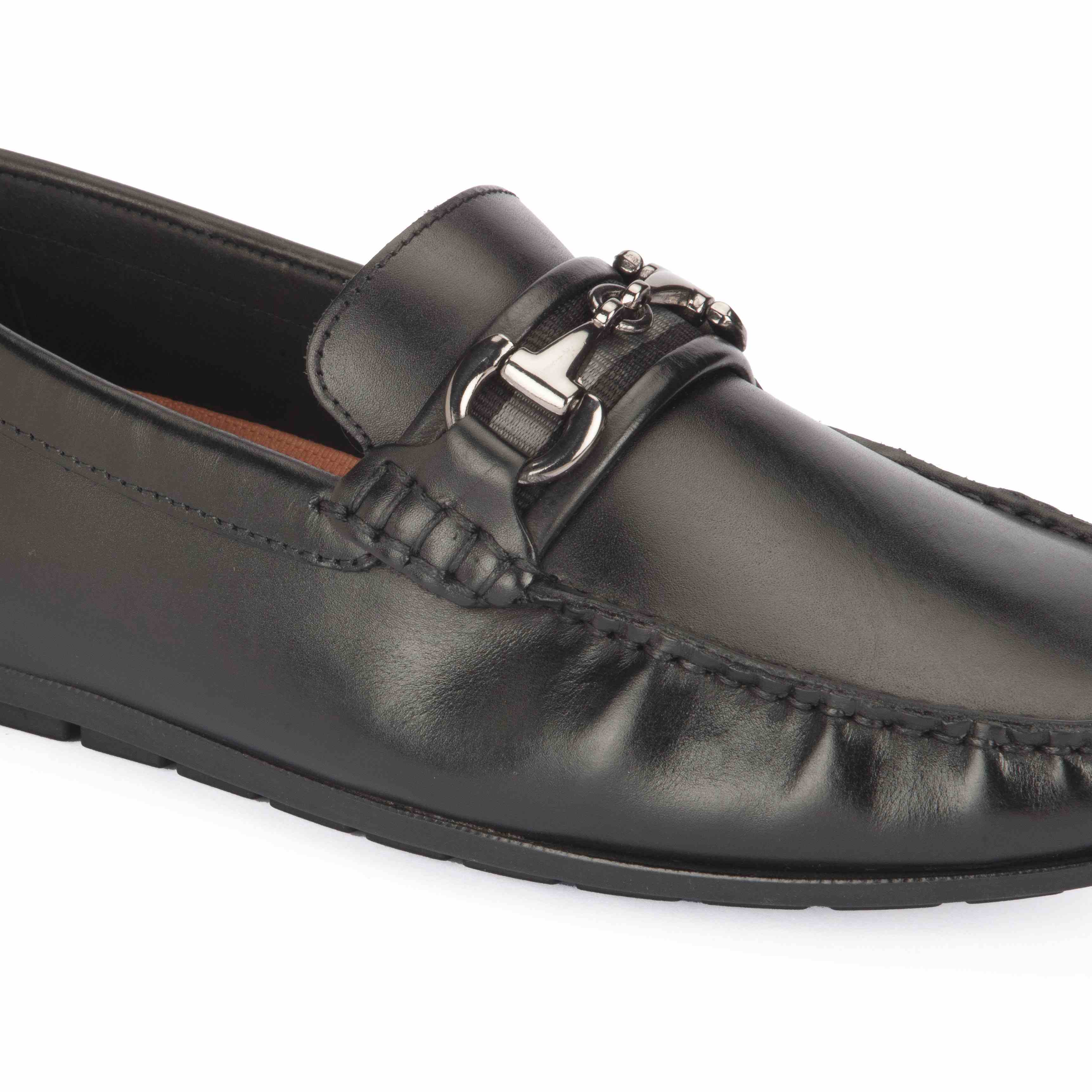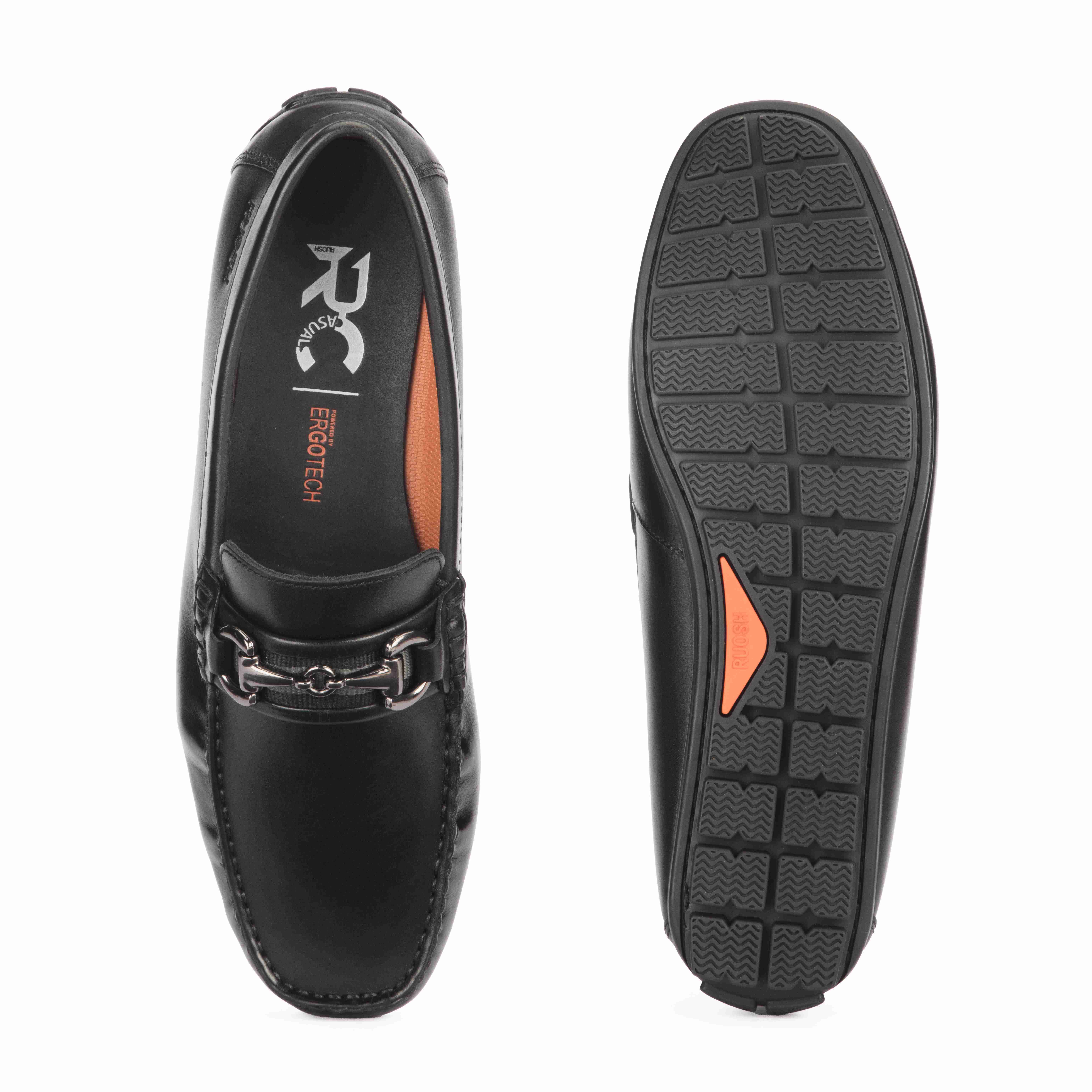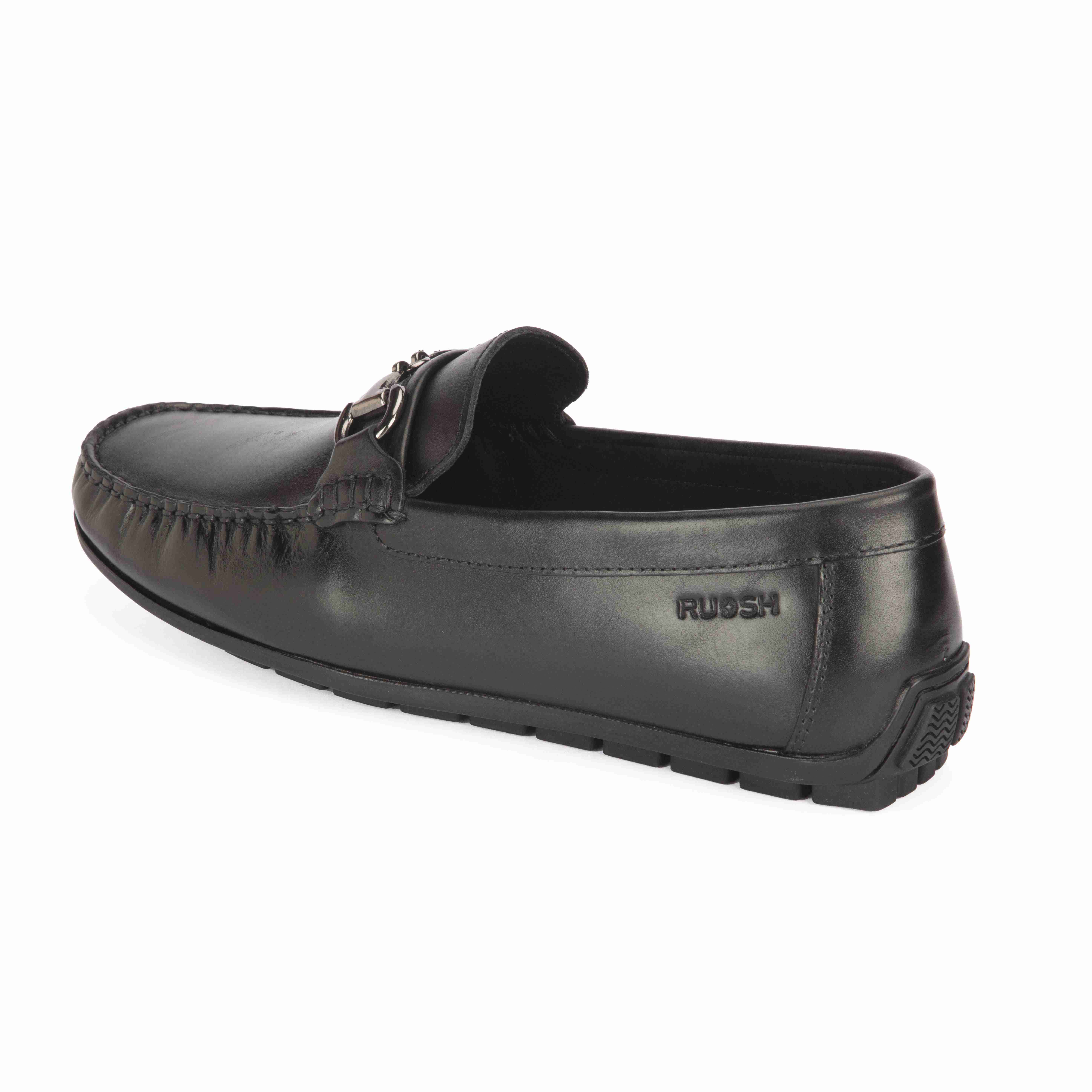 Crafted From Premium Black Leather, These Ruosh Drivers Exude Effortless Elegance. The Sleek Silhouette Is Enhanced By A Bold Metal Buckle Detail, Adding A Refined Edge To Your Everyday Or Smart-Casual Looks. Flexible And Lightweight, They Promise Comfort With Every Step.