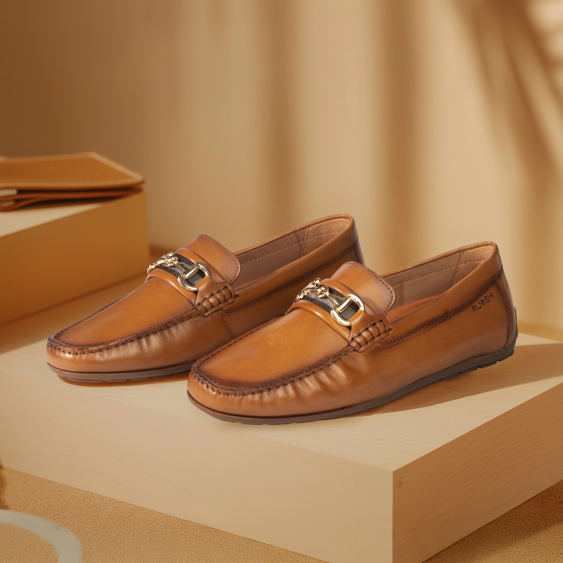 Channel Relaxed Sophistication With These Tan Leather Drivers From Ruosh. The Warm Tone And Gleaming Metal Buckle Combine To Create A Stylish Yet Laid-Back Aesthetic. Perfect For Weekend Outings Or Casual Office Days, These Shoes Offer Plush Comfort And Versatile Appeal.